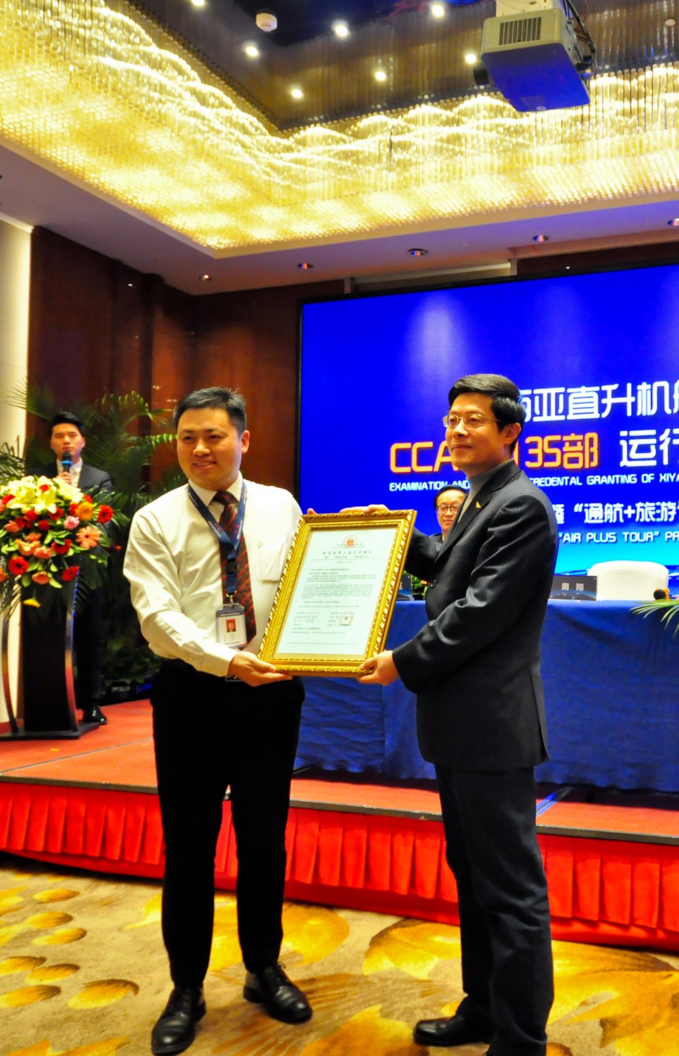 在頒證儀式上,西亞航空總經理盛宇對公司CCAR-135部應審情況作了匯報,民航新疆管理局飛標處副處長兼西亞航空主任運行監察員王發中對公司CCAR-135部審定工作情況進行總結。民航新疆管理局副局長周翔向西亞航空總經理盛宇頒發了CCAR-135《運行合格證》。